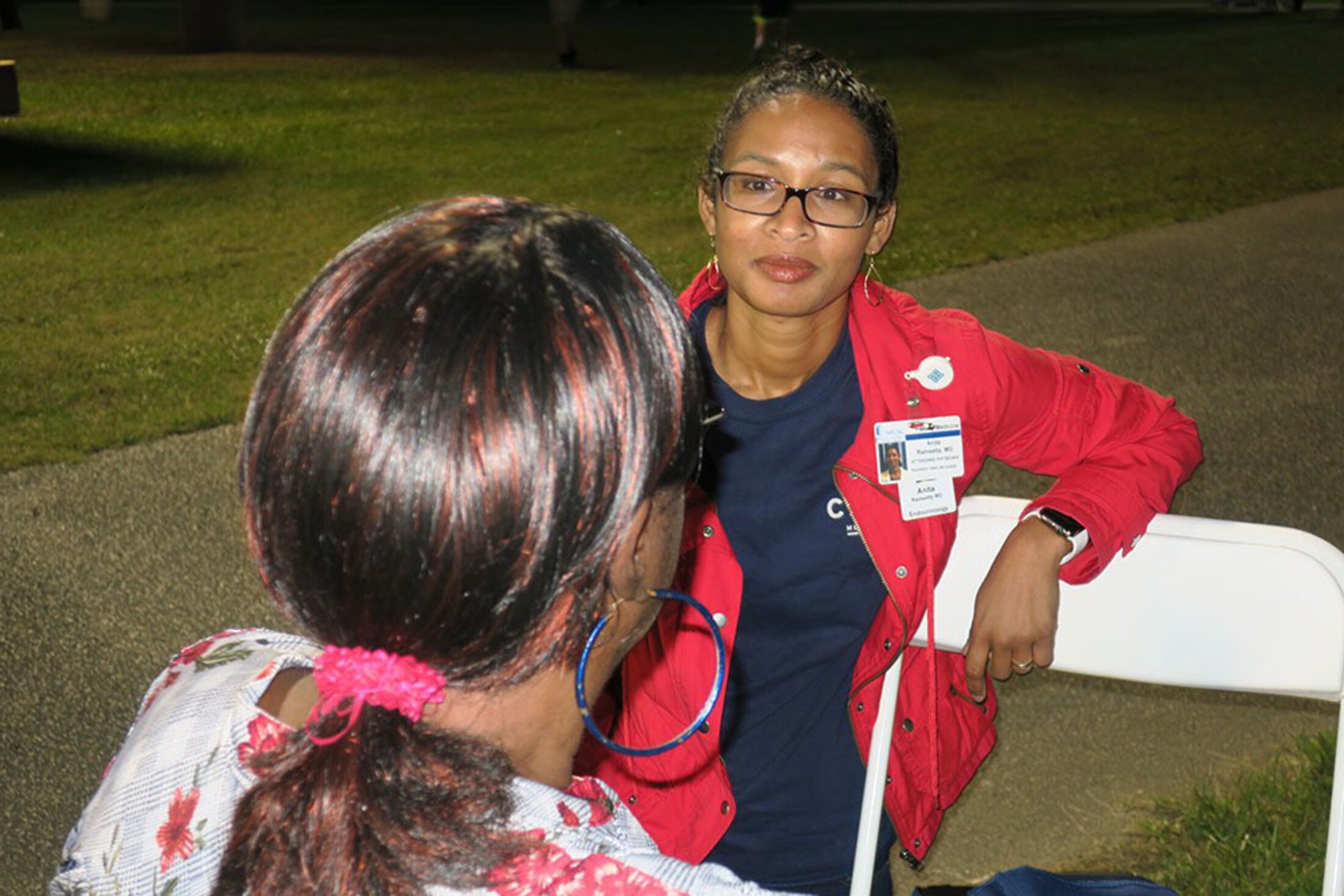 Katherine Smalls listens closely to the doctor as she sits at a pop-up health screening table by the stadium. “I love sweet,” she admits.