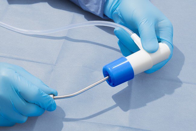 Using a pressurized saline system and a patented clearing mechanism, the VayuClear device can clear the suction tube in 1 to 3 seconds without breaking the contained loop of body fluids.