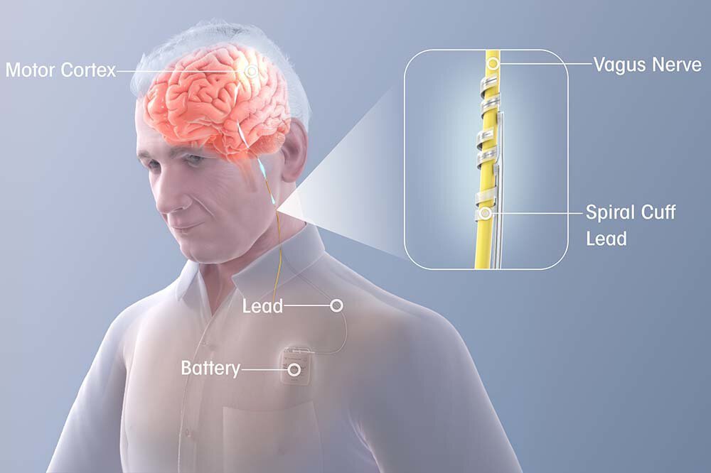 “In antiquity, the vagus was known as the wandering nerve because it travels all the way from the brainstem down to other internal organs. When the brain needs to send messages to the heart and the gut, for instance, it uses the vagus nerve to do so. However, if you artificially stimulate the vagus nerve itself, you can have beneficial effects the other way around, that is, on the brain. That is what this form of vagus nerve stimulation is attempting to do.”