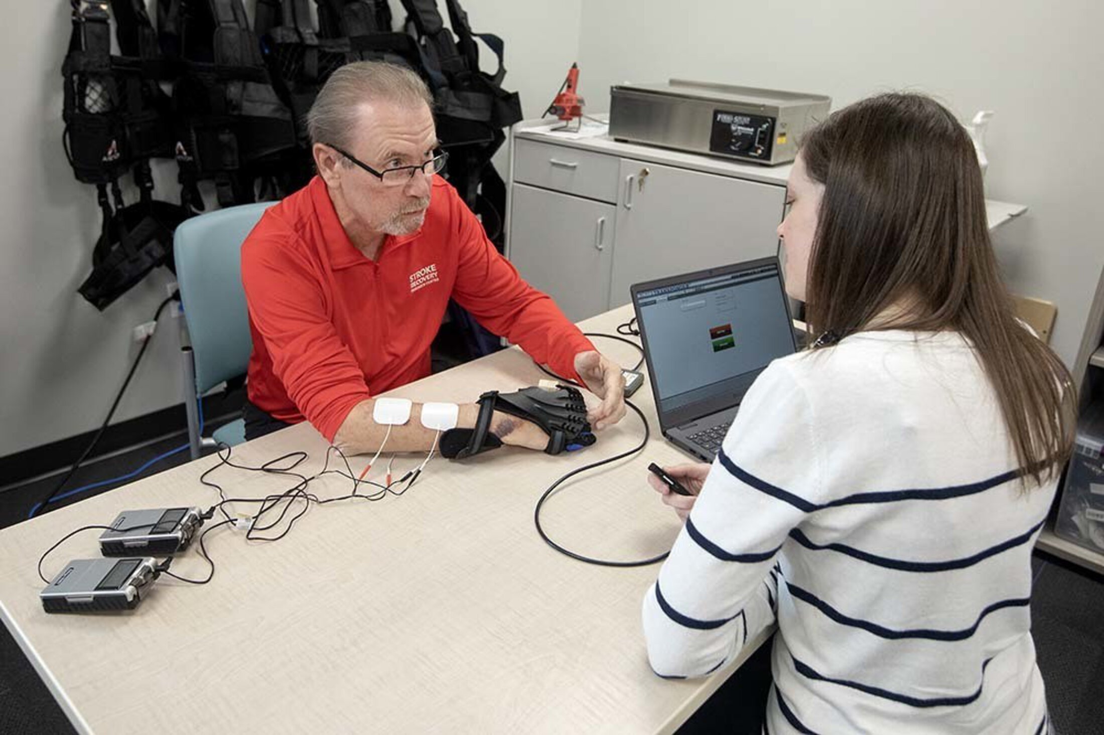During a recent morning appointment, Alanna Herman, one of Billy’s occupational therapists, worked with him on grasp and release using a stroke therapy glove, as well as electrical stimulation to his forearm, to allow for greater movement. As Orbach worked on straightening his fingers, Herman stimulated his vagus nerve to drive neuroplasticity, the ability of the brain to promote neural recovery.
